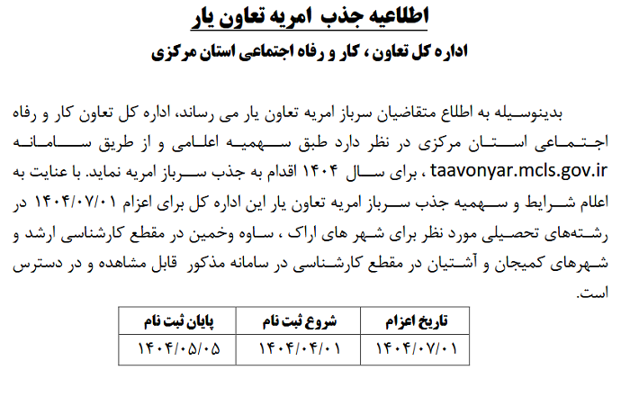اطلاعیه جذب امریه تعاون یار ۱۱ تیر ۱۴۰۴ | ۱۲:۰۴ کد : ۵۲۷۴۸ اطلاعیه ارسال به دیگران نام شما ایمیل شما ایمیل دریافتکننده ارسال انصراف تعداد بازدید:۱۳۳۸ اطلاعیه جذب امریه تعاون یار