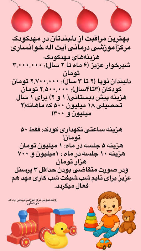 به اطلاع می‌رساند، در راستای تحقق قانون حمایت از خانواده و جوانی جمعیت، مهدکودک مرکز آموزشی درمانی آیت اله خوانساری از تاریخ 1/ 3/ 1404 به طور رسمی آغاز به کار نموده و آماده ارائه خدمات به فرزندان پرسنل می‌باشد. این مهد کودک با رعایت حدنصاب تعداد کودکان و بر اساس ظرفیت مکانی موجود، آمادگی پذیرش فرزندان پرسنل سایر واحدهای تابعه دانشگاه را نیز دارا می‌باشد.