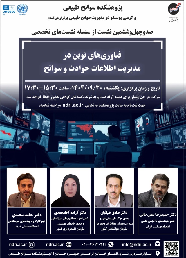 نشست فن آوری نوین در مدیریت اطلاعات حوادث وسوانح ۳۰ آذر ۱۴۰۴ | ۱۲:۰۴ کد : ۵۷۱۴۹ اطلاعیه ارسال به دیگران نام شما ایمیل شما ایمیل دریافتکننده ارسال انصراف تعداد بازدید:۱۴۳ دعوتنامه نشست فن آوری نوین در مدیریت اطلاعات حوادث وسوانح