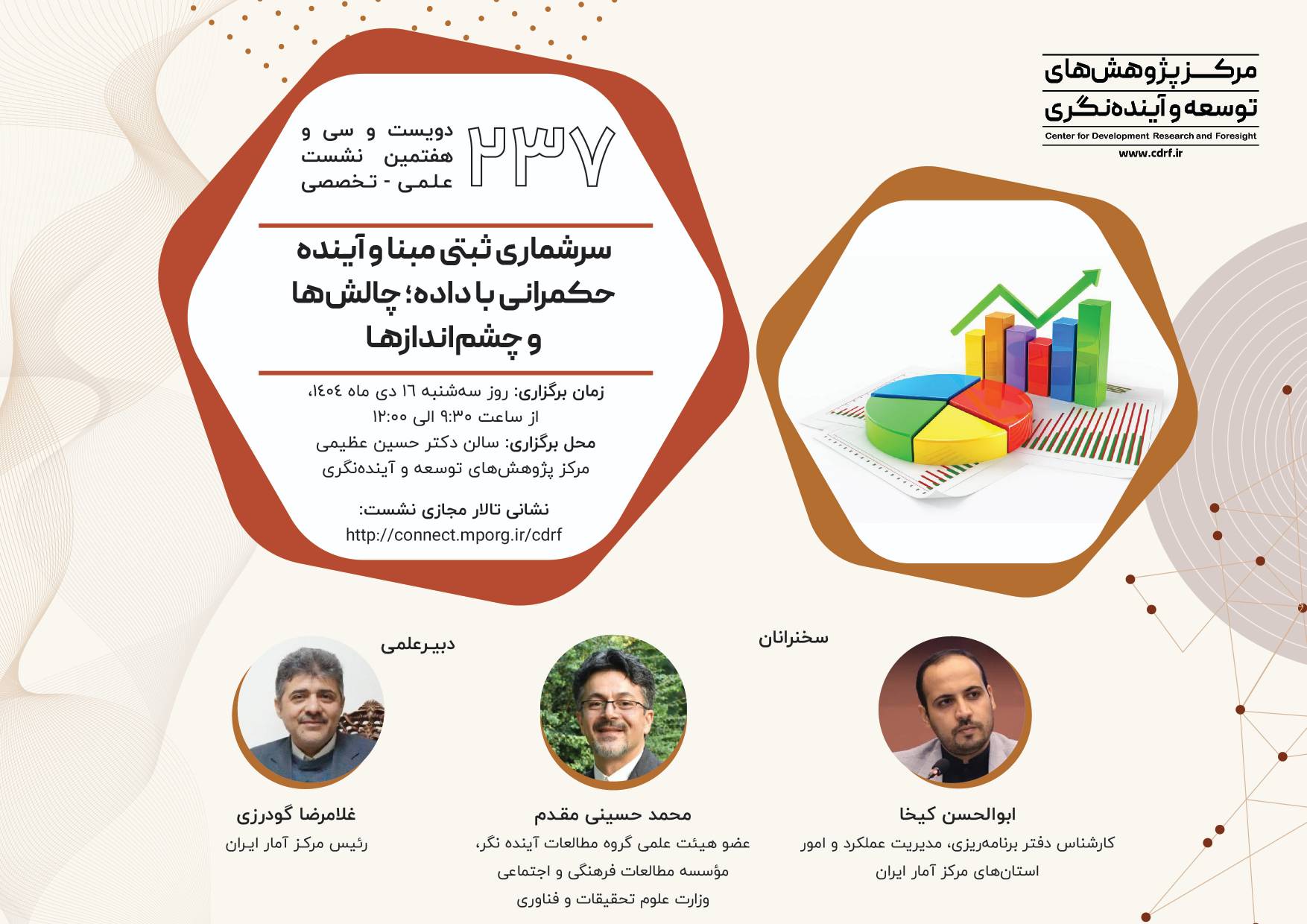 نشست علمی سرشماری ثبتی مبنا آینده حکمرانی با داده ۱۴ دی ۱۴۰۴ | ۱۰:۲۱ کد : ۵۷۴۱۸ اطلاعیه ارسال به دیگران نام شما ایمیل شما ایمیل دریافتکننده ارسال انصراف تعداد بازدید:۴۴۶ دویست وسی وهفتمین نشست علمی - تخصصی با عنوان سرشماری ثبتی مبنا آینده حکمرانی با داده، چالش ها وچشم اندازها