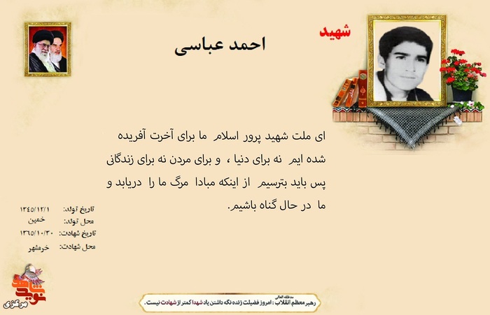 فرازی از وصیت نامه شهدا ۱۳ دی ۱۴۰۴ | ۱۰:۰۱ کد : ۵۷۴۶۹ اطلاعیه ارسال به دیگران نام شما ایمیل شما ایمیل دریافتکننده ارسال انصراف تعداد بازدید:۱۱۶ فرازی از وصیت نامه شهدا فرازی از وصیت نامه شهید بزرگوار احمد عباسی :
