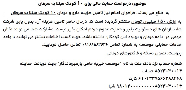 درخواست حمایت مالی، برای ۱۰ کودک مبتلا به سرطان ۰۷ بهمن ۱۴۰۴ | ۱۱:۳۳ کد : ۵۷۷۳۲ اطلاعیه ارسال به دیگران نام شما ایمیل شما ایمیل دریافتکننده ارسال انصراف تعداد بازدید:۸۴ موسسه خیریه حامی یار، درخواست حمایت مالی، برای ۱۰ کودک مبتلا به سرطان را دارد.